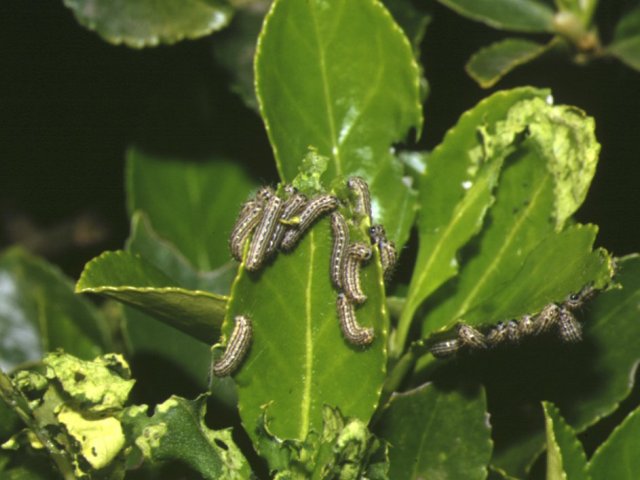 説明 幼虫がマサキをはじめとするニシキギ科の葉を食害し、幼虫の個体数が多い場合は、全葉が食べ尽くされることもある。1年1回の発生。成虫は晩秋に出現しマサキの枝先に産卵する。そのまま越冬した卵からは、マサキの新芽が膨らみ始めるころに幼虫が孵化する。若齢幼虫期は集団で、大きくなると単独でマサキの葉を食害する。5月中旬までには老熟し、マサキから離れて石の下面などに繭を作り蛹化する。その後夏を蛹の状態で過ごし、晩秋に羽化する。 |