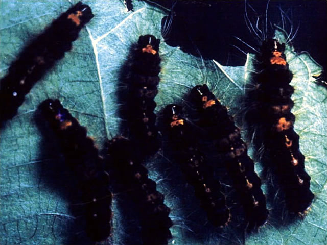 説明 成虫は開長、雄25~33mm、雌37~42mmで黄色に褐色の帯状斑をもつ蛾。終齢幼虫は、体長約40mm、黒色で側面と背面にオレンジ色の斑紋がある。年1化、成虫は6~7月頃発生、幼虫は夏にふ化して集団で摂食、10齢内外を経過して落葉下などで越冬、翌年4月頃から再び新芽を食害し、13~17齢で老熟して単独生活をする。食樹はサクラ、ウメ、バラ、クヌギ、カキなど多種にわたる。毒針毛をもち、触れると発疹と激しいかゆみを起こす。幼虫の毒針毛は脱皮殻、繭、蛹、成虫、卵にも付着しており、これらに触れることも危険であるとともに、灯火に飛来した成虫がまき散らした毛でも被害が起こる。本種による食害は5~6月頃が多いが、食葉性害虫である以上に衛生害虫としての問題の方が大きい。 |