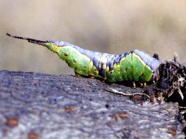 成虫の開張35~40mm。幼虫の体長35mm程度、黄緑色で、前胸から尾端にかけて、黄色に縁取られた顕著な茶色の紋がある。尾端には長い尾状突起があり、刺激を与えると紅色の紐状物質を出す。成虫は5~6月、7~8月の年2回発生。ポプラ、ヤナギ類を食害する。