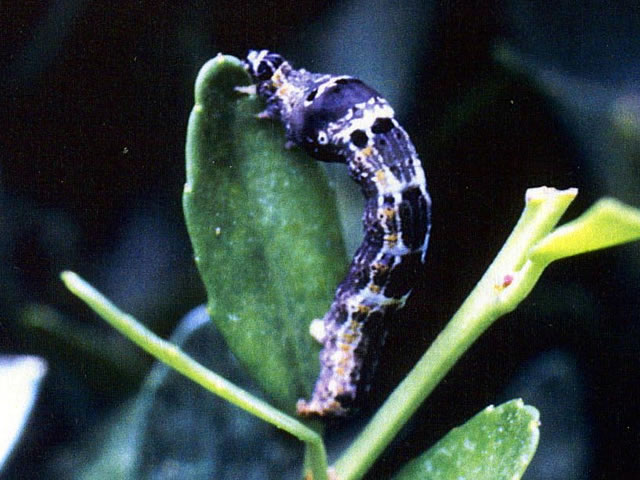 説明 成虫の開張23~26mm。幼虫は体長約25mm、後胸から第一腹節にかけて顕著に太く、前方にいくに従って狭まる。胴部は灰褐色の地に、黒褐色の班をまとう。成虫の出現は4月と6~8月の2回。1回目の幼虫は6~7月に成熟し、また2回目の幼虫は9月下旬以降に蛹化して越冬する。イヌツゲを食害する。 |