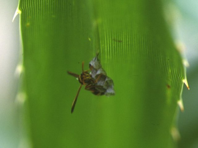 説明 体長は約9~10mm。体色は褐色で黄紋がある。ススキ、アダン、サトウキビなどの葉裏やイスノキなどの細枝に営巣する。3月頃から営巣が開始される。1匹の創設メスが巣を創設する場合と複数の創設メスが創設する場合がある。5~8月にかけて働きバチが羽化し、最盛期の働きバチ数は100匹程度になる。繁殖メス(新女王)の多くは交尾後も巣にとどまって越冬する。草刈り時に刺されることがあるが、痛みは少ない。 |