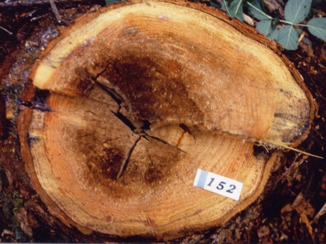 説明 主に針葉樹の根株心材腐朽を起こすが、特にカラマツに多く発生する。カラマツ造林上、最も重要な病害の一つである。本菌は枯死した根や地際部の傷などから侵入し根や幹の地際部を腐朽させるが、地上10m位まで腐朽被害が進展する場合もある。腐朽した材は褐色となり、立方状に亀裂が入り、指でつぶすと粉状に崩壊する。被害木には外見上の変化はなく、伐採して初めて腐朽被害がわかる場合が多い。しかし、ある程度腐朽が進展した樹木においては地際部に子実体が形成されるので、これが被害発生の目安となる。子実体は褐色~黄褐色、半円形~円形、有柄あるいは無柄、直径5~50cm、表面はビロード状、傘の裏面は管孔状である。 |