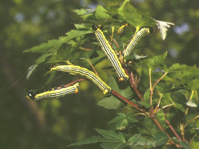 説明 幼虫が街路樹のカエデ類に稀に大発生し全葉を食害してしまうため、紅葉を観光資源とした地域においては、重要な害虫であるといえよう。成虫の開張は35~40mm、老熟幼虫の体長は30~35mm。1年のうち6月および8月の2回発生。蛹で越冬したものが6月に羽化する。成虫は交尾後、葉の裏面に一層の塊状に産卵する。2齢幼虫までは集団で食害、脱皮する。3齢幼虫も集合する性質があるが、以後は単独でも食害できる。幼虫は6月下旬には老熟し、食樹を離れ落葉層内あるいは浅い土中で粗い繭を作り蛹化する。8月には2世代目の成虫が出現し10月下旬には老熟幼虫となり蛹化し、越冬する。1世代目の幼虫による被害は、1本の枝先1mくらいの全葉が摂食される程度であるが、2世代目には幼虫の個体数(集団数)も増えるため被害も目立つようになる。 |