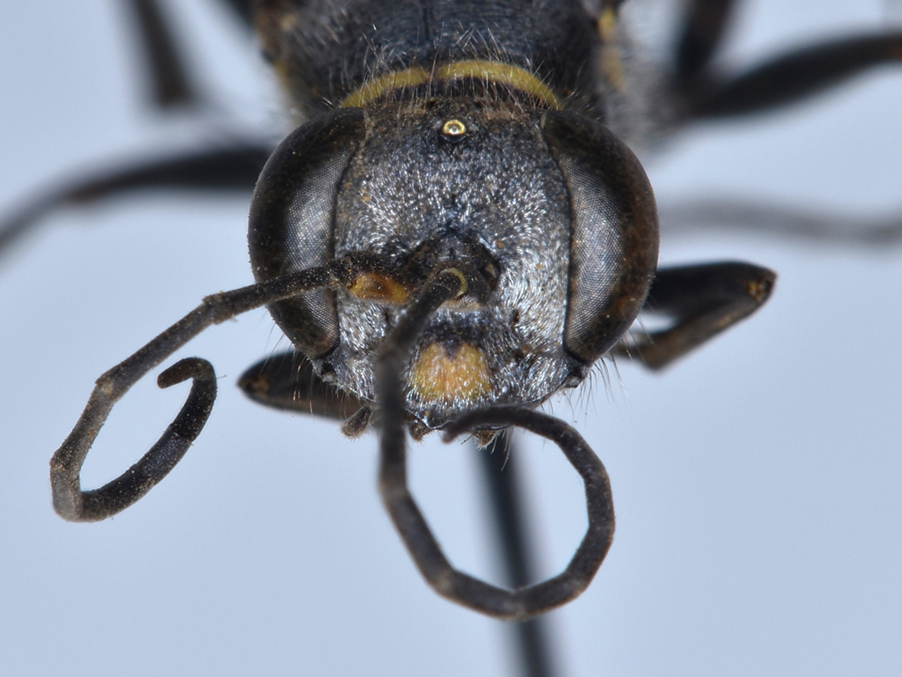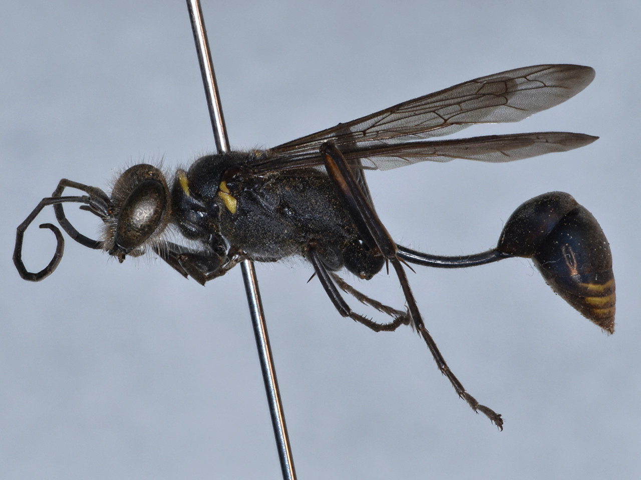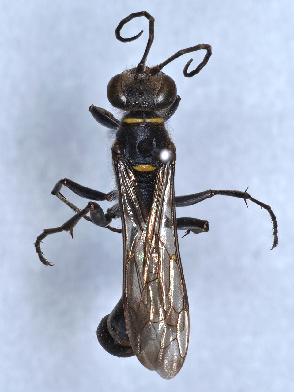 体は黒色で、前胸背板、中胸側板、小盾板、前伸腹節に黄色部がある.腹部第1、2節の後縁は赤褐色。基本的に借孔性ではないが、太めの竹筒内に泥壺状の巣を造ることがある。ハエトリグモ類を狩る。