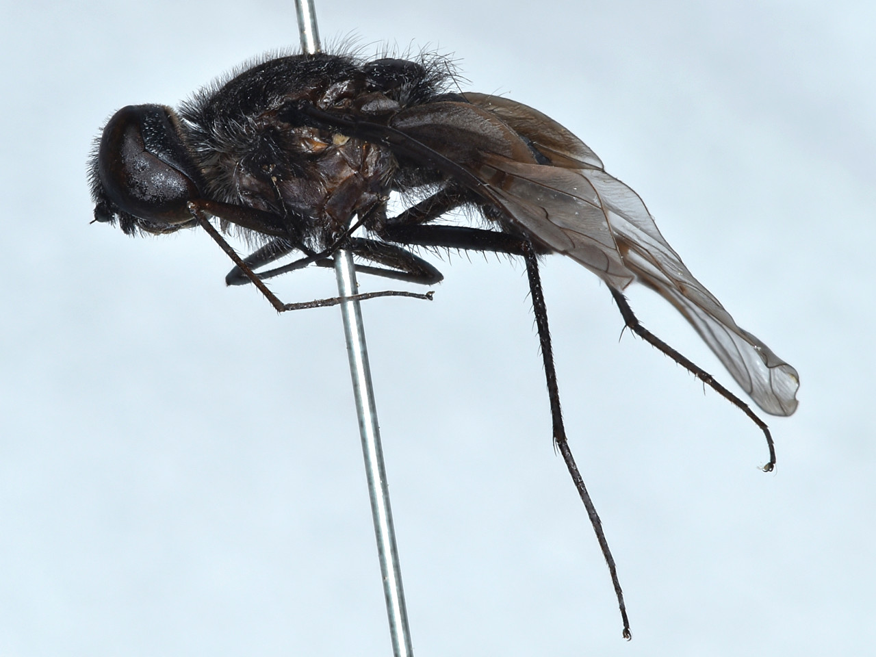 体は黒色。腹部第1節側方に白色の長毛が密生する。翅の基部半分は斜めに黒色で、透明な先半分には黒斑が2つある。各種のカリバチ類やハナバチ類に寄生する。