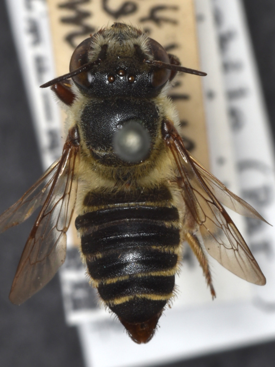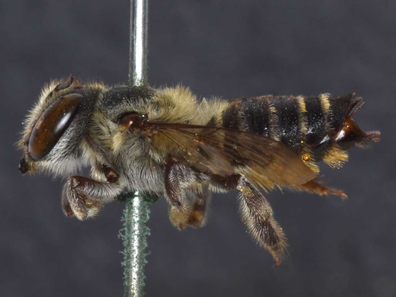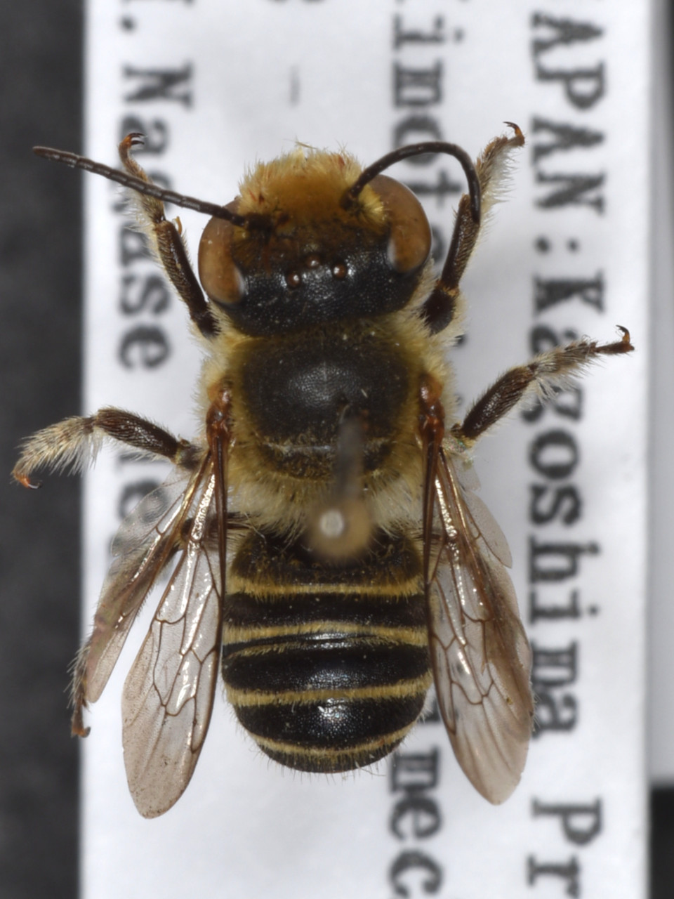 Megachile subalbuta Yasumatsu, 1936 Body black, antennae and legs reddish brown. Body hairs mostly grayish white in females, with black hairs on top of the head and thorax (mesosoma).