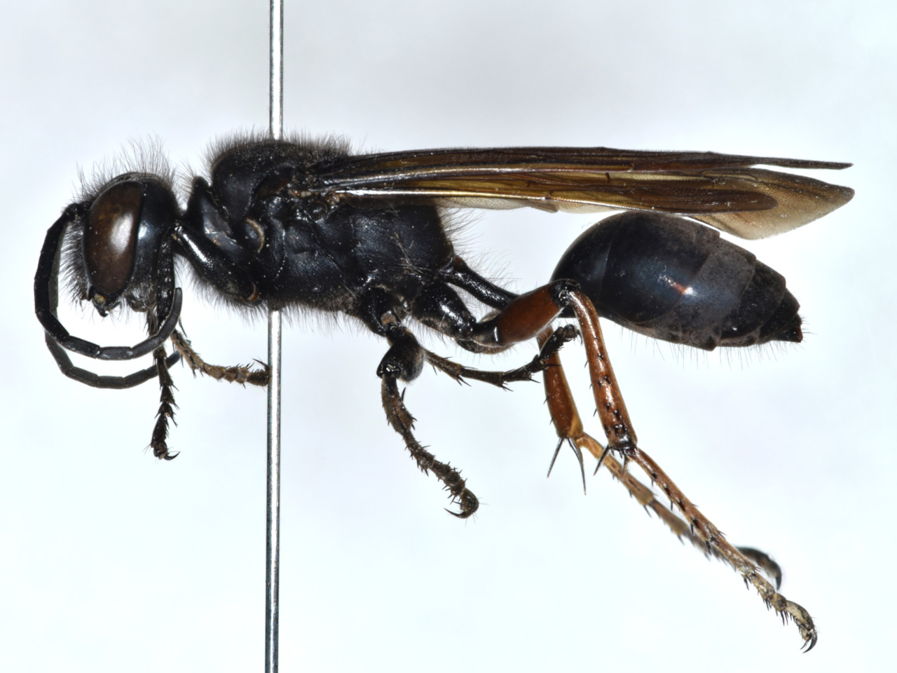 Body black, hind femora, tibiae, and femora red. This wasp nests in burrows in dead trees or bamboo tubes, using mainly moss to make partitions. It hunts tettigoniids for larval food. Multiple larvae often coexist in a single cell. This species is often found in relatively moist environments such as forests along streams, possibly because it uses moss as nest material.