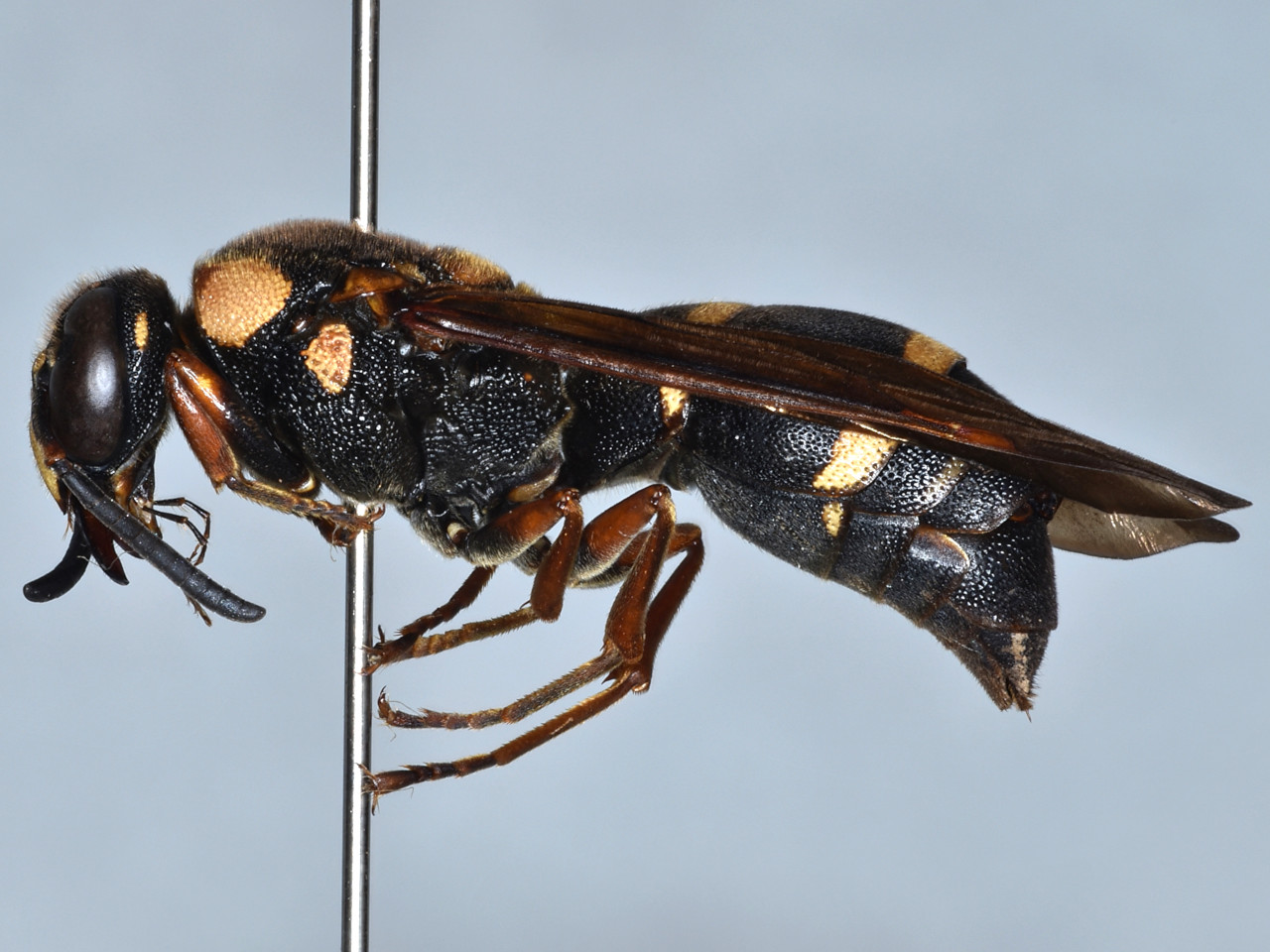 Body black, with a yellow band on the first and second gastral tergites. Divided into eight subspecies according to region. This wasp, active from May to October, nests in old galleries of wood boring beetles or bamboo tubes, partitioning brood cells with mud. It hunts moth larvae of Pyralidae or Tortricidae, and stores them in the cells as larval food. This wasp is one of the most common species found in trap nests in and around residential areas.