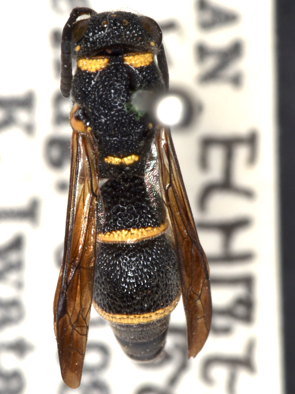 Stenodynerus frauenfeldi (de Saussure, 1867) Body black with a yellow band on the posterior margin of the first and second gastral tergites. Very similar to Stenodynerus chinensis, though distinguishable by a yellow spot on the tegulae. It hunts moth larvae of Tortricidae, etc.