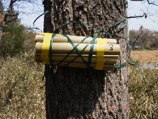 The trap-nest that we use is made of bamboo or reed tubes with an inner diameter of about 5–20 mm, cut into 20 cm pieces. Different species of bees and wasps prefer different diameters, so it is recommended to mix tubes of various diameters so that more species can nest. We can make a trap by arranging the tubes like a bamboo screen, or simply by bundling them with strings. Nesting frequencies and species compositions of bees and wasps have been shown to be alike between the two types of trap.