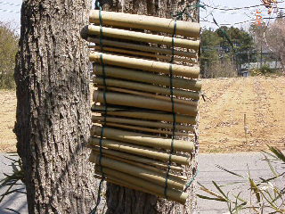 20cm程度に切った、内径5~20mmくらいの竹やヨシを組んで作ります。ハチの種によって好みの太さが違うので、いろいろな太さの竹筒を混ぜたほうがたくさんの種が営巣します。竹筒を束ねるやり方や、「すだれ」のように並べるやり方がありますが、営巣するハチの種はそれほど変わらないようです。